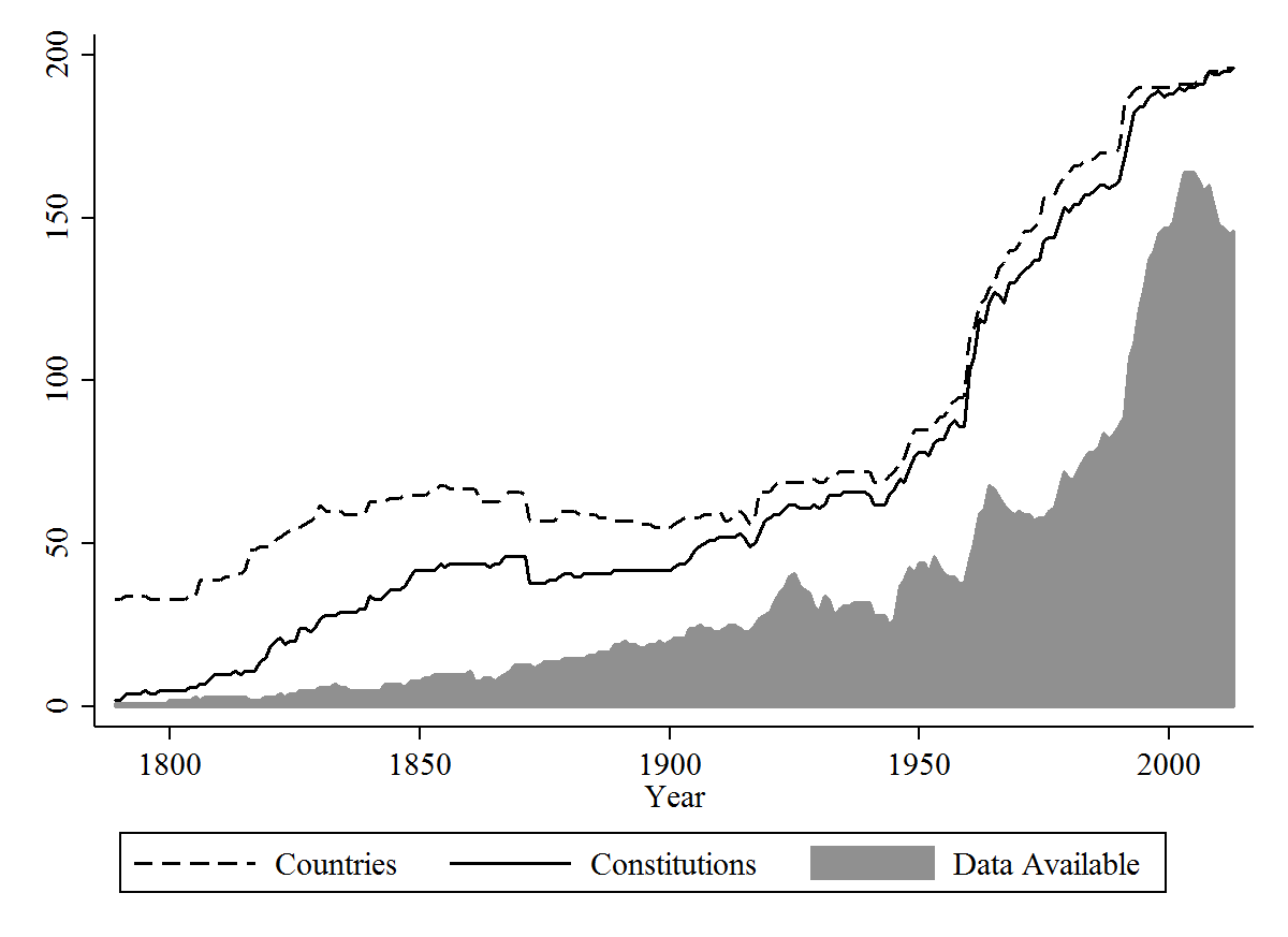 The figure below illustrates the relationship between the CCP’s characteristics data and its chronology. The dashed line indicates the number of independent states in each year from 1789 to 2013. The solid line indicates the number of constitutions in force in independent states in each of those years. The shaded area represents the country-years for which the CCP has released data on the characteristics of national constitutions. Overall, the characteristics data are available for 52% of country-years for which there was a constitution in force. As illustrated in the figure, this percentage varies quite a bit over time, ranging from only having data available for about 40% of countries circa World War II to data available for about 85% of countries for much of the last decade.