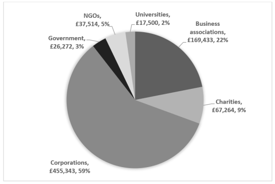 However, 2001 and 2017 registries not only reveal a change in how external support is provided to APPGs, but also in who is providing it. As shown in the table, the value of the monetary support given to British APPGs more than doubled between 2001 and 2017. Charts 2 and Chart 3 break down this support by the nature of the sponsoring organisations. They show that business interests dominated the support given to APPGs in 2001, with corporations and business associations together providing 81% of all funds received. Yet by 2017, business associations and corporations accounted for just 53% of funding, while charities and NGOs surged to a combined 42% – up three-fold from 2001.