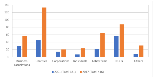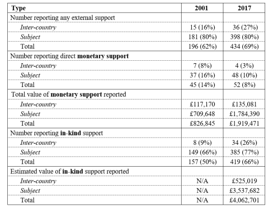 What can the patterns of support to APPGs tell us about the reasons for group growth? To explore this question, I used webscraping software to capture the external support declared in the last APPG registries produced prior to the 2001 and 2017 elections. Changes in the registry system during that period means that the information is not perfectly comparable. Most problematic is the absence of any estimate for the value of in-kind contributions on the 2001 registry. Nonetheless, the data provide an indication of how the support provided to British APPGs has changed over the past decade and a half.