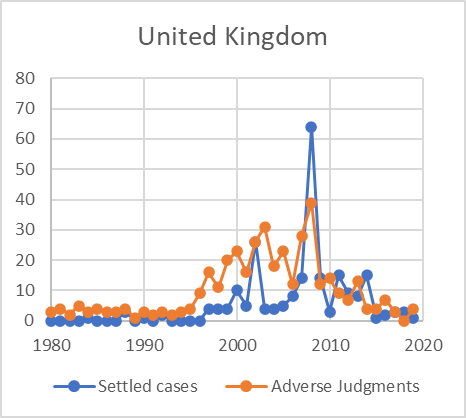 An increasingly popular strategy of avoiding an adverse judgement from the ECtHR is to settle applications brought by potential victims before a judicial decision is made. For the ECtHR, the settlement process operates as a workload management tool, allowing it to reduce the number of applications it deals with. For states, the settlement process allows them to avoid adverse judgments, which would stain their reputation, but more importantly also avoids decisions being made that could potentially require changes to their internal laws, policies, and structures. As a consequence, settlement has quickly become a popular way of making potential violations of human rights ‘go away’. Many European states have taken advantage of this approach. As the graph below shows, the UK only rarely makes use of settlement – at least as far as formal and readily accessible records suggest. Other countries, such as Hungary and Poland, are amongst the highest settlers of human rights applications and they settle as many cases as they lose. This difference in approach is clearly seen from the graphs below: on one side, we see the UK, where the settlement practises by the UK are minimal (with only 2008 as an exception, where we see a jump in the number of settled cases related to widower’s allowance cases).