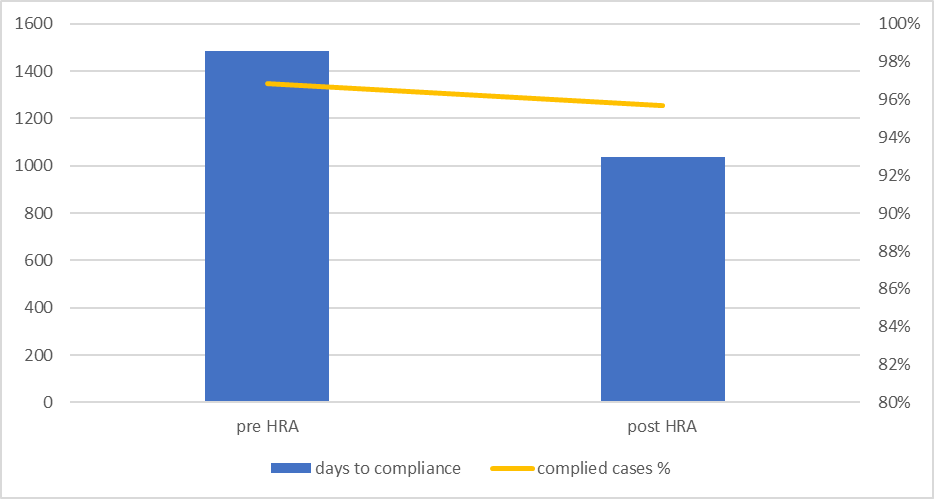 The current government’s approach departs significantly from the carefully fostered image of a good complier the UK has fostered over its 60-plus year membership of the Convention. The enactment of the Human Rights Act 1998 and its entry into force in 2000 reinforced the UK’s commitment to the ECHR and compliance with the ECtHR’s decisions. As the graph below reveals, on average, the UK’s compliance rate – the percentage of adverse judgments in respect of which it has adopted remedying measures – has remained at 96%. This means that in the majority of cases, the UK has addressed the concerns raised by the ECtHR. However, the timeframe within which it did so fell considerably after the adoption of the Human Rights Act, which incorporated the ECHR into English law and empowered domestic judges to give force to it. As a consequence, ECtHR judgments were enforced much faster. Prior to the Human Rights Act coming into force, the average length to compliance was 1485 days (more than 4 years), but afterwards the average compliance speed was 1036 days, (i.e. a year shorter). The ability of UK courts to aid in the process of enforcement was therefore key in speeding up compliance and in turn securing the UK’s reputation as a ‘good complier’.
